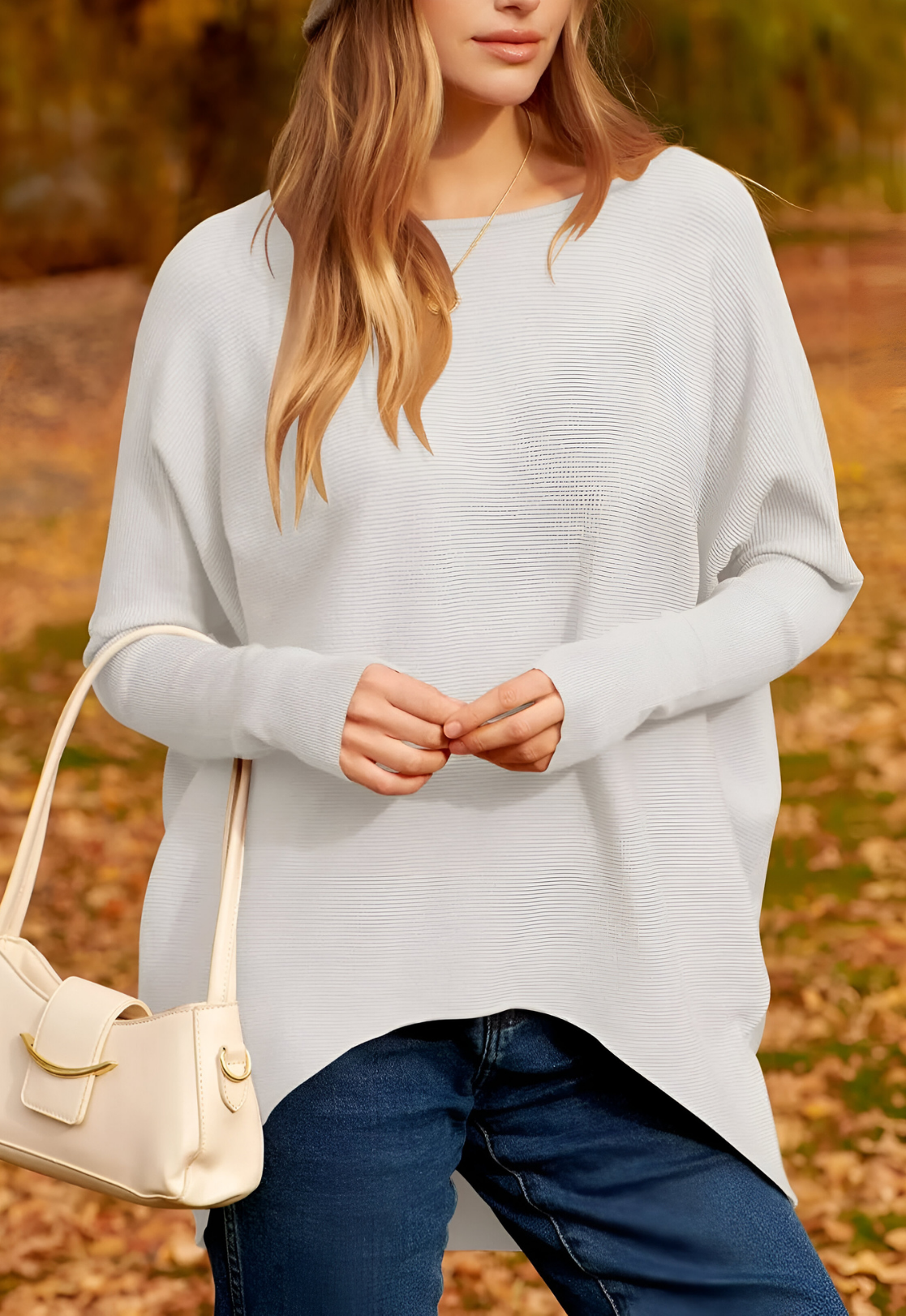 • Generous boat neckline paired with batwing long sleeves