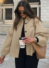 The Out-Shine Ease - Cropped Trench Jacket seamlessly combines contemporary minimalism with traditional trench design. Tailored for a loose fit, this airy jacket boasts a defined collar, roomy sleeves, and a button-front fastening that exude effortless charm. Its cropped silhouette provides a modern flair, making it a fantastic layering option for changing seasons. Whether combined with smart trousers for a refined appearance or jeans for a laid-back vibe, this trench-inspired jacket is a crucial addition to any closet.