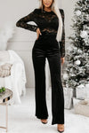 Out-Shine | Lace Velvet Patchwork Long Sleeve Belted Flare Stretch Jumpsuit