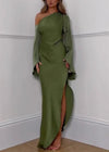 The Out-Shine - One-Shoulder Satin Gown beautifully merges modern style with sophisticated elegance. This stunning gown boasts a one-shoulder neckline complemented by a gracefully draped bell sleeve and a daring thigh-high slit that radiates confidence and poise. Made from exquisite satin, its smooth and flowing design enhances every silhouette while infusing an element of class. Ideal for upscale events, galas, or weddings, this gown guarantees that you will make a remarkable impression.